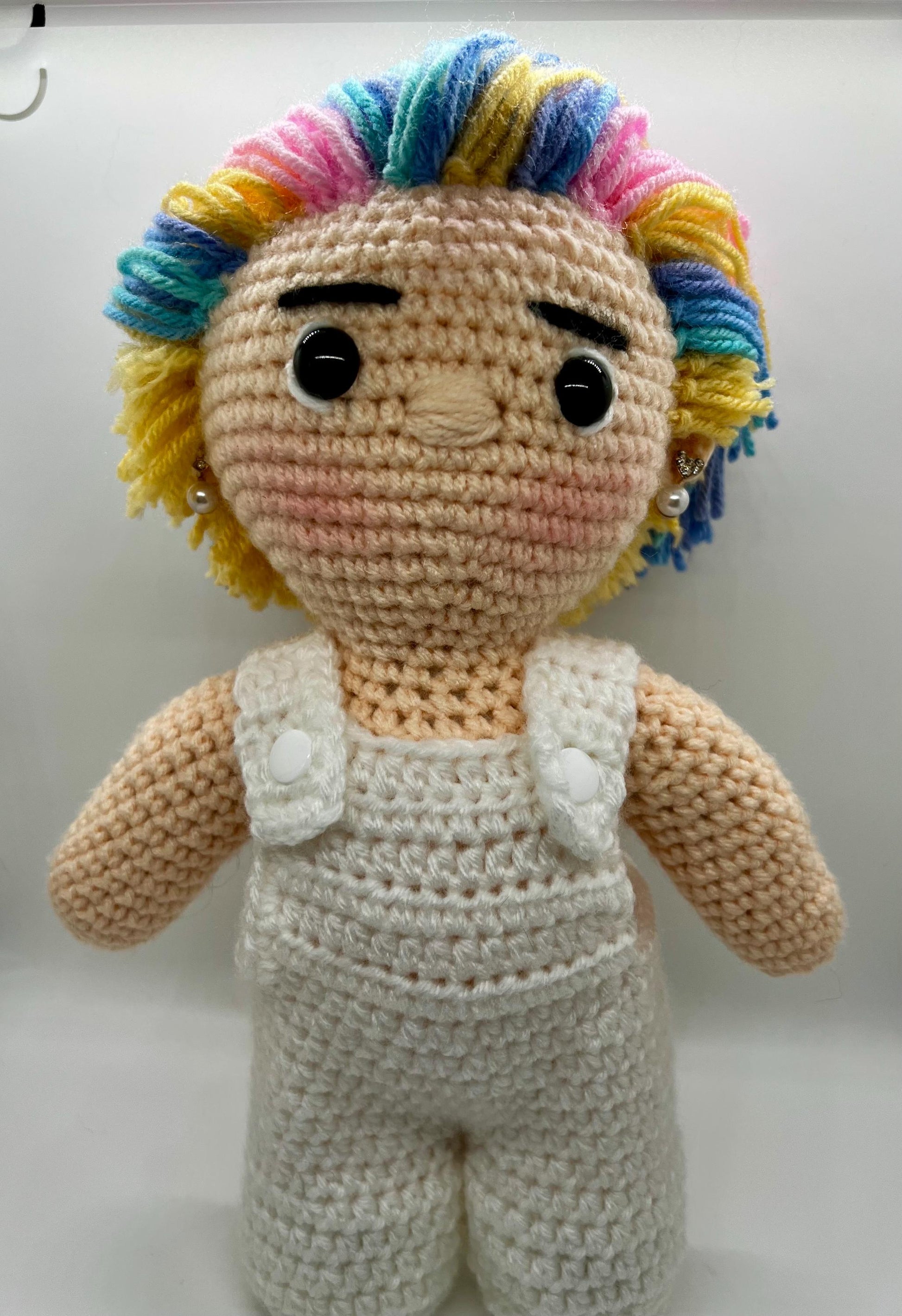 This doll is a recreation of that fun moment of one of their greatest hits. The doll stands about 12 inches tall, it is made with acrylic yarn, stuffed with polyfill and has plastic safety eyes so should not be used by small children as the eyes are small enough to swallow.