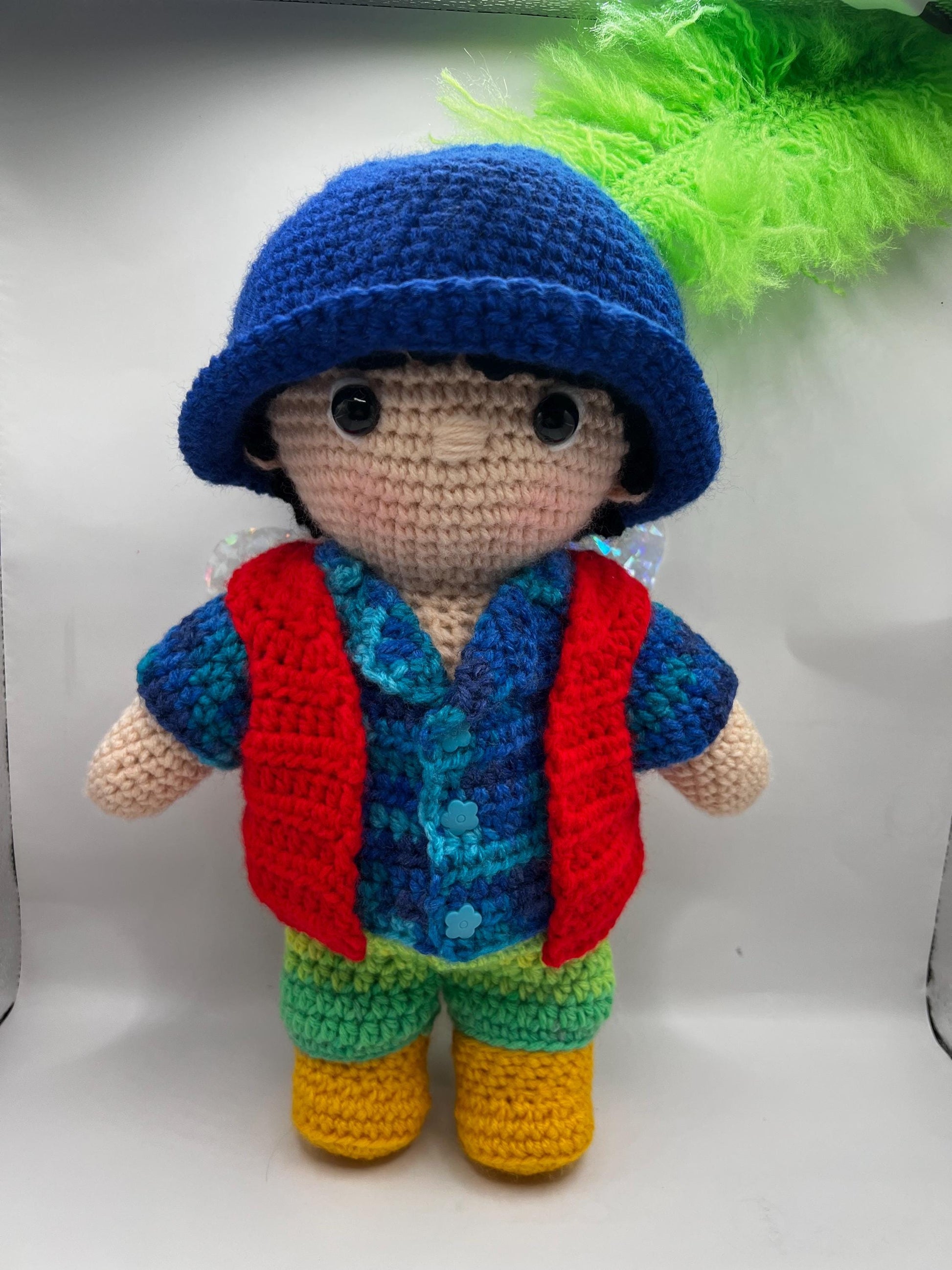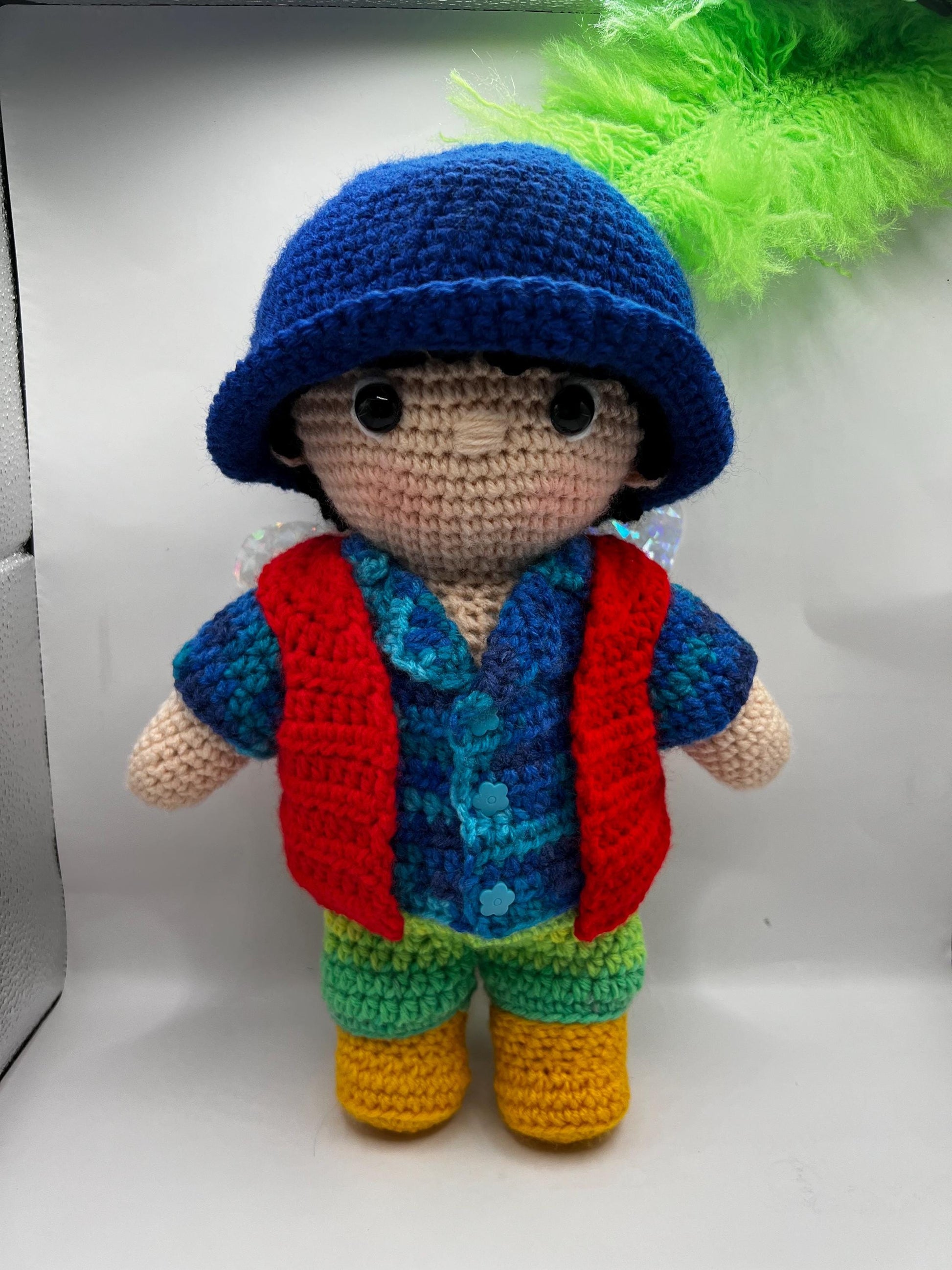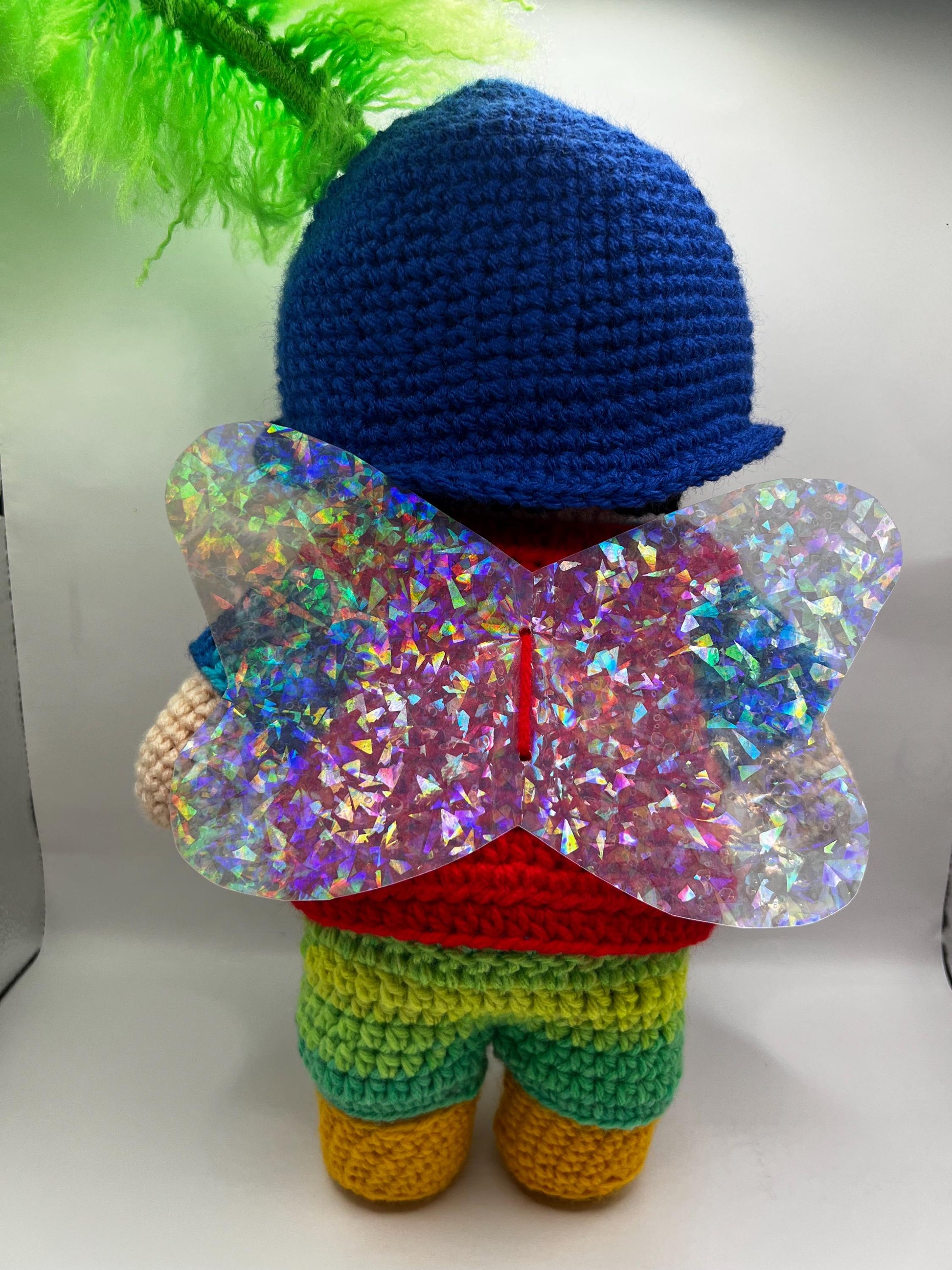 - He is wearing a LOT of clothes including gold booties, greenish-yellow pants, blue shirt, red vest with Mylar holographic wings stitched onto the back, a blue fedora with a green feather in the cap.