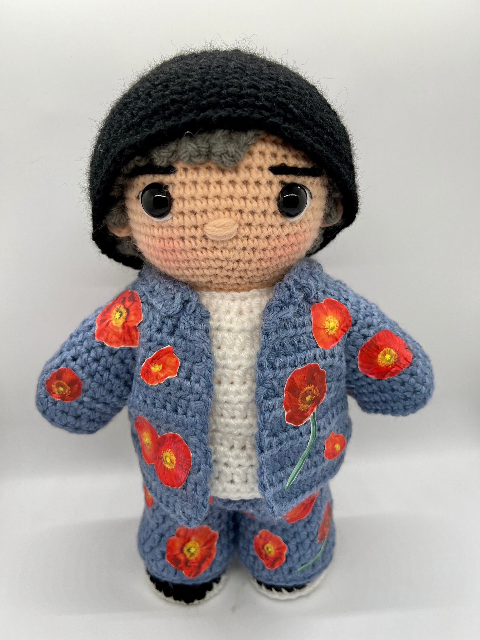 - He is wearing a white shirt, blue denim pants and blue denim jacket with red poppy flowers heat transferred on the yarn. He is wearing a black beanie and black sneakers. All clothing items are removable. He has gray hair (namjoon was in his gray hair period during this time).