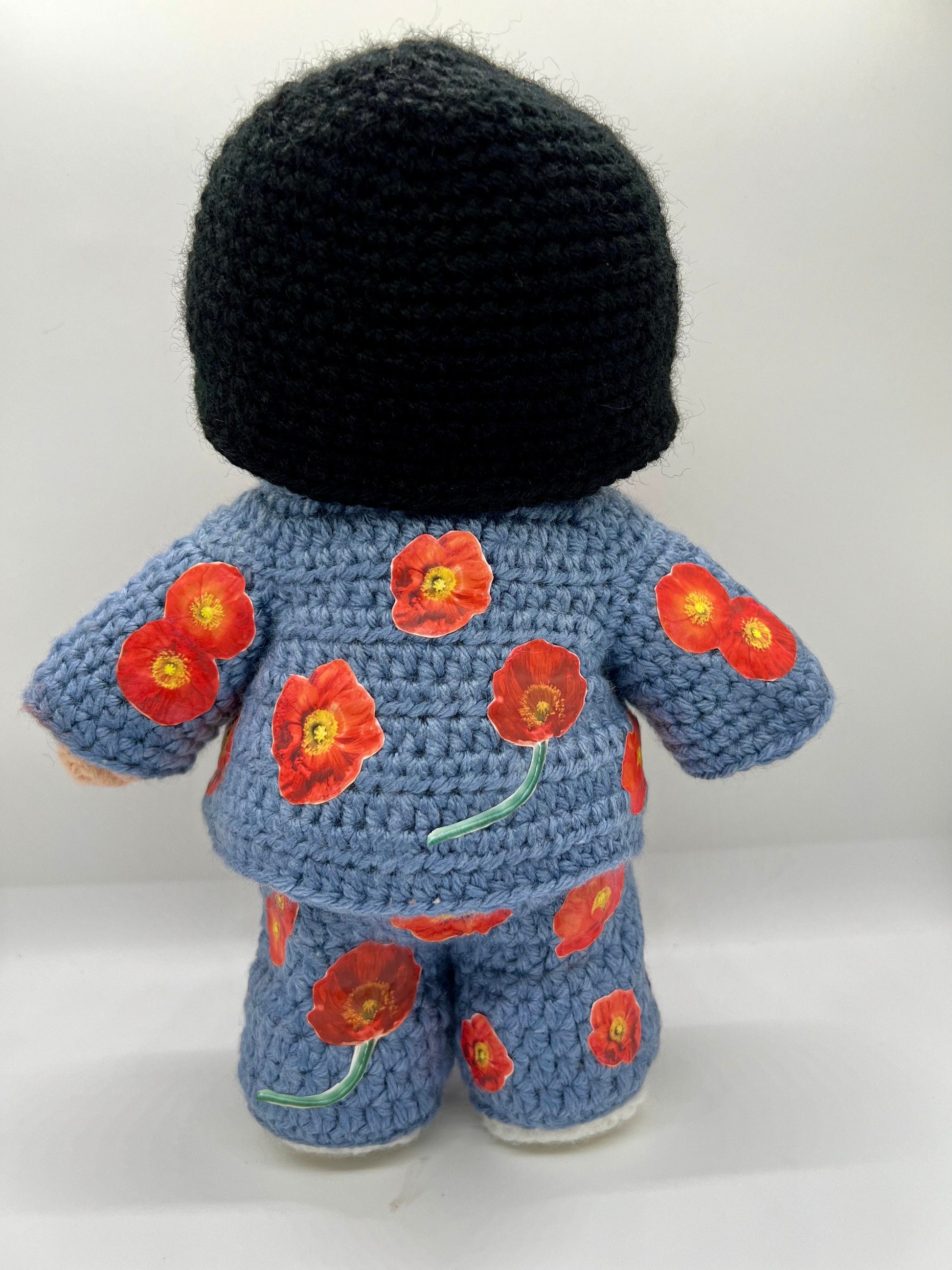 I wanted to capture this outfit in a commemorative doll, but I couldn’t figure out how to depict the poppy flowers, but I finally figured out that they would look ok with heat transfer flowers. The doll stands almost 11 inches tall.
