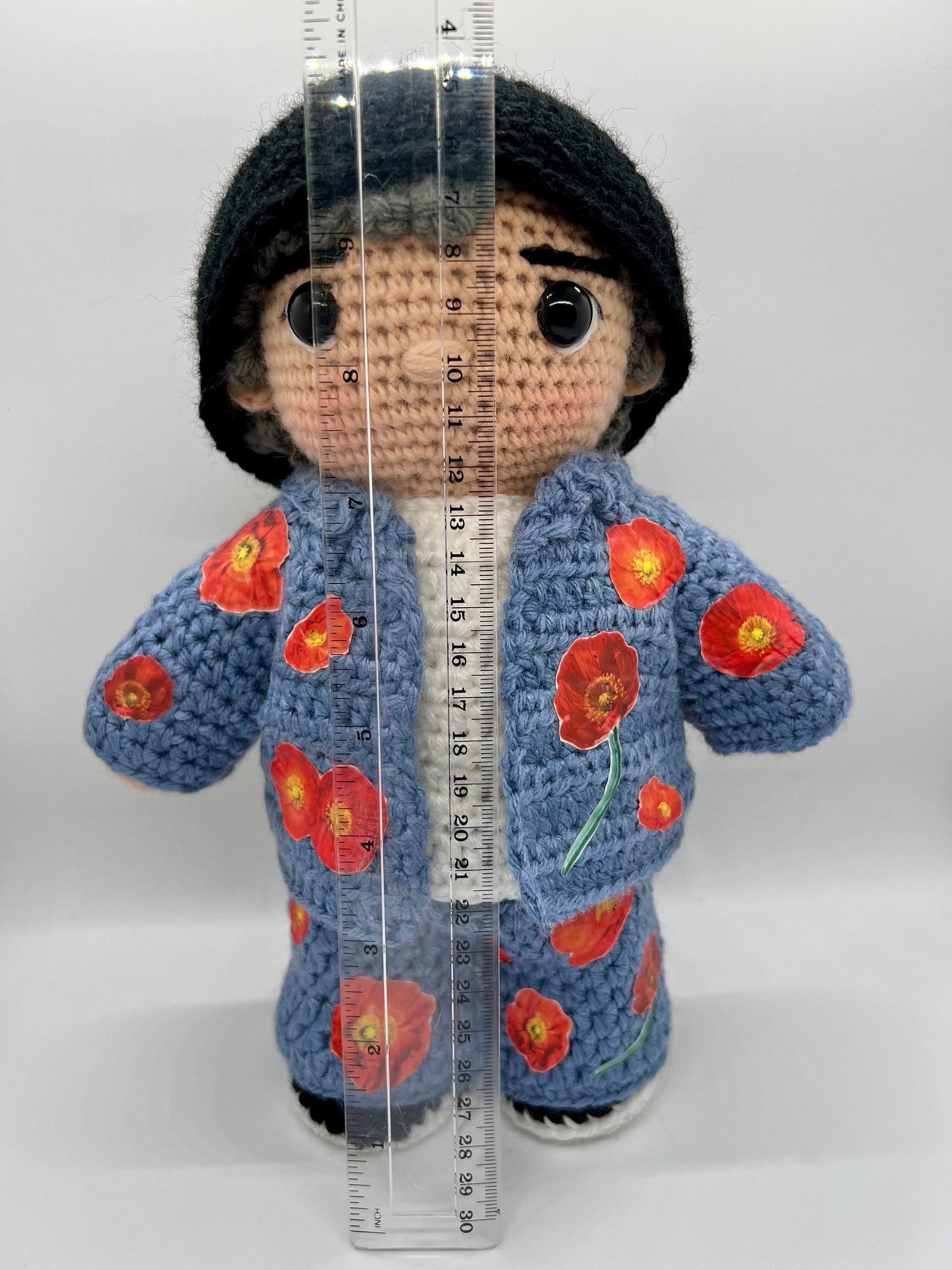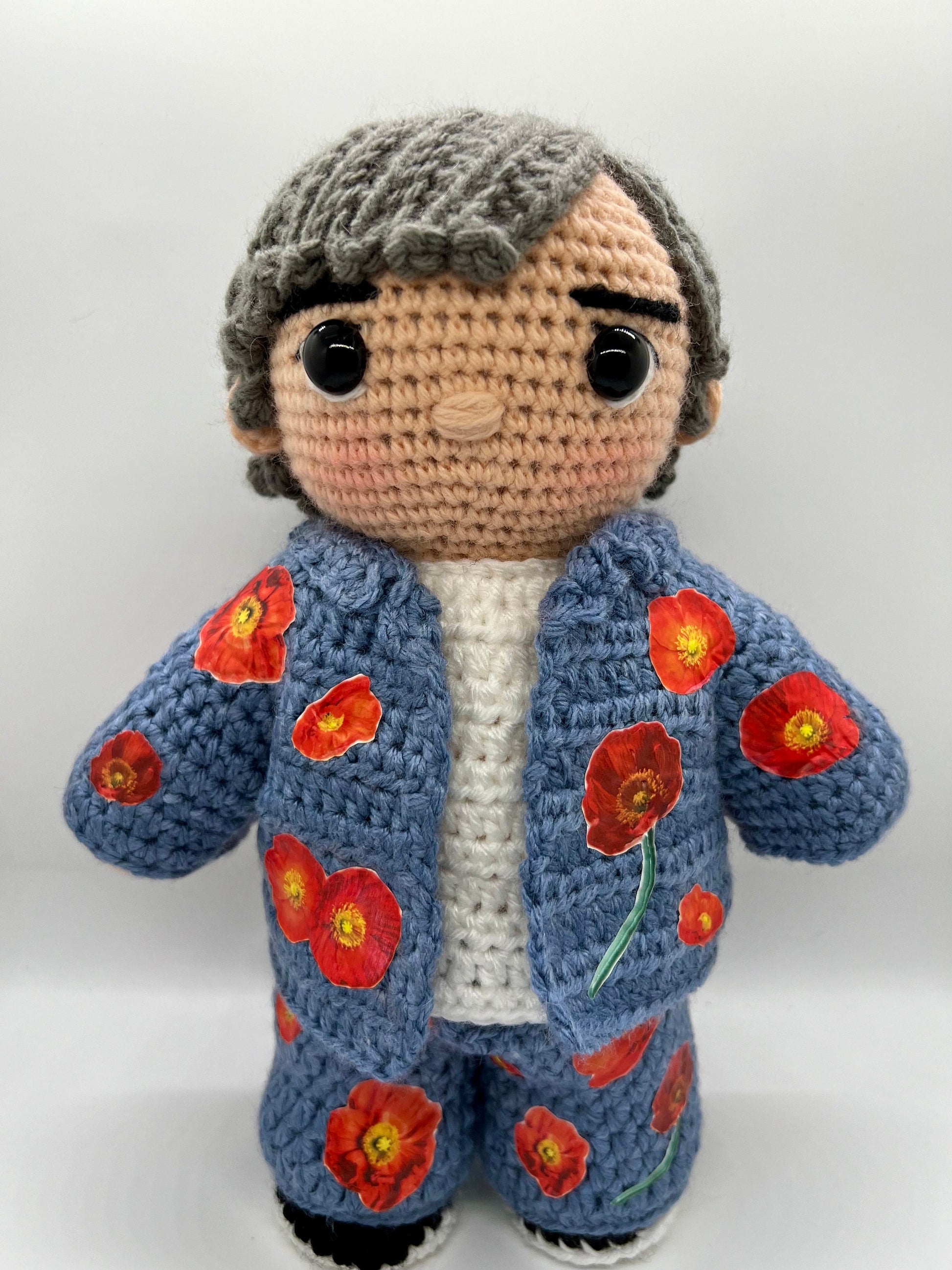 - He is made of 100% acrylic yarn, stuffed with polyfill and has plastic safety eyes so should not be used as a toy for small children as they are small enough to be swallowed.