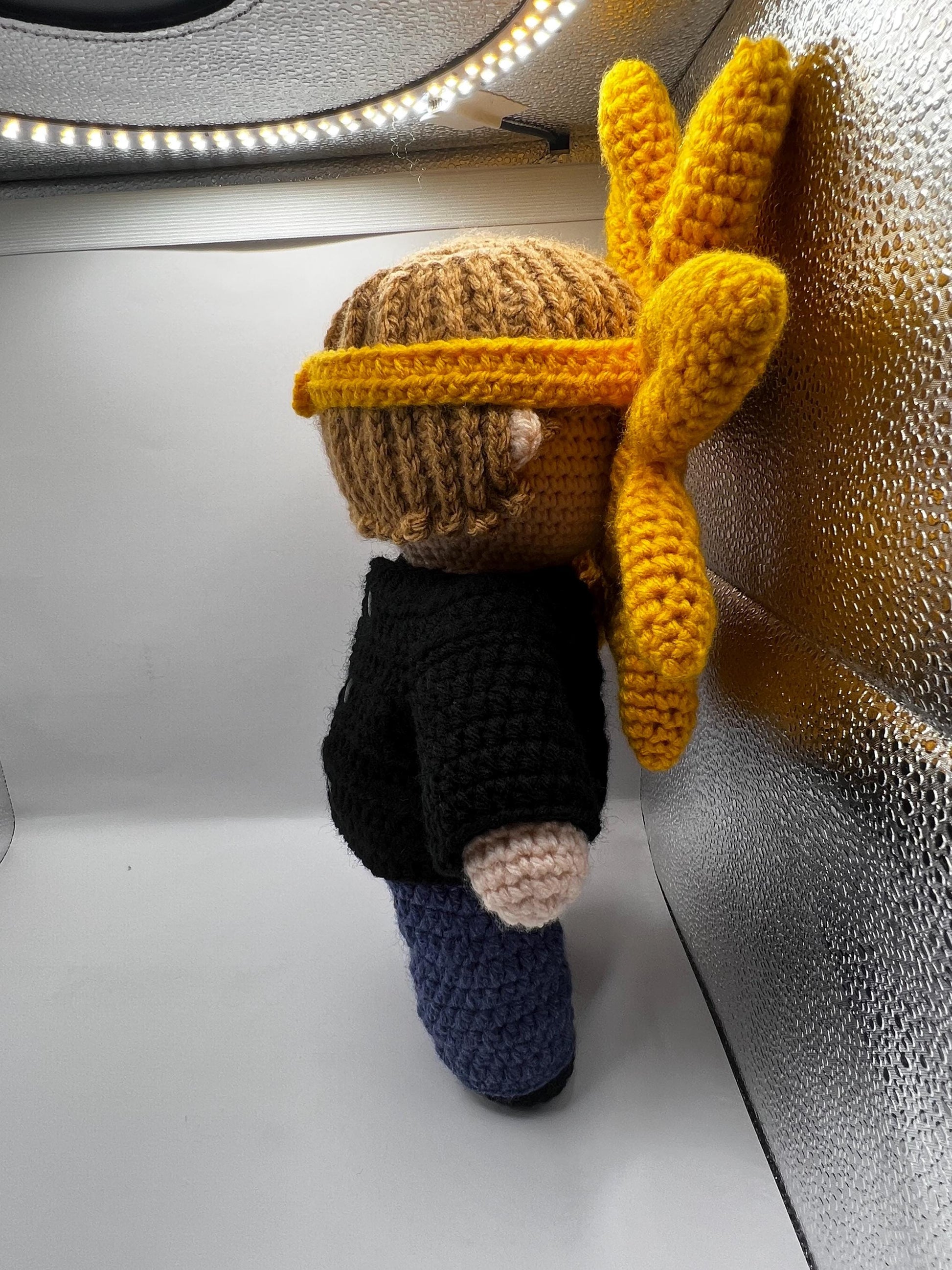 - The doll is wearing a black long-sleeved top, denim pants, black booties and the sunflower head dress.
