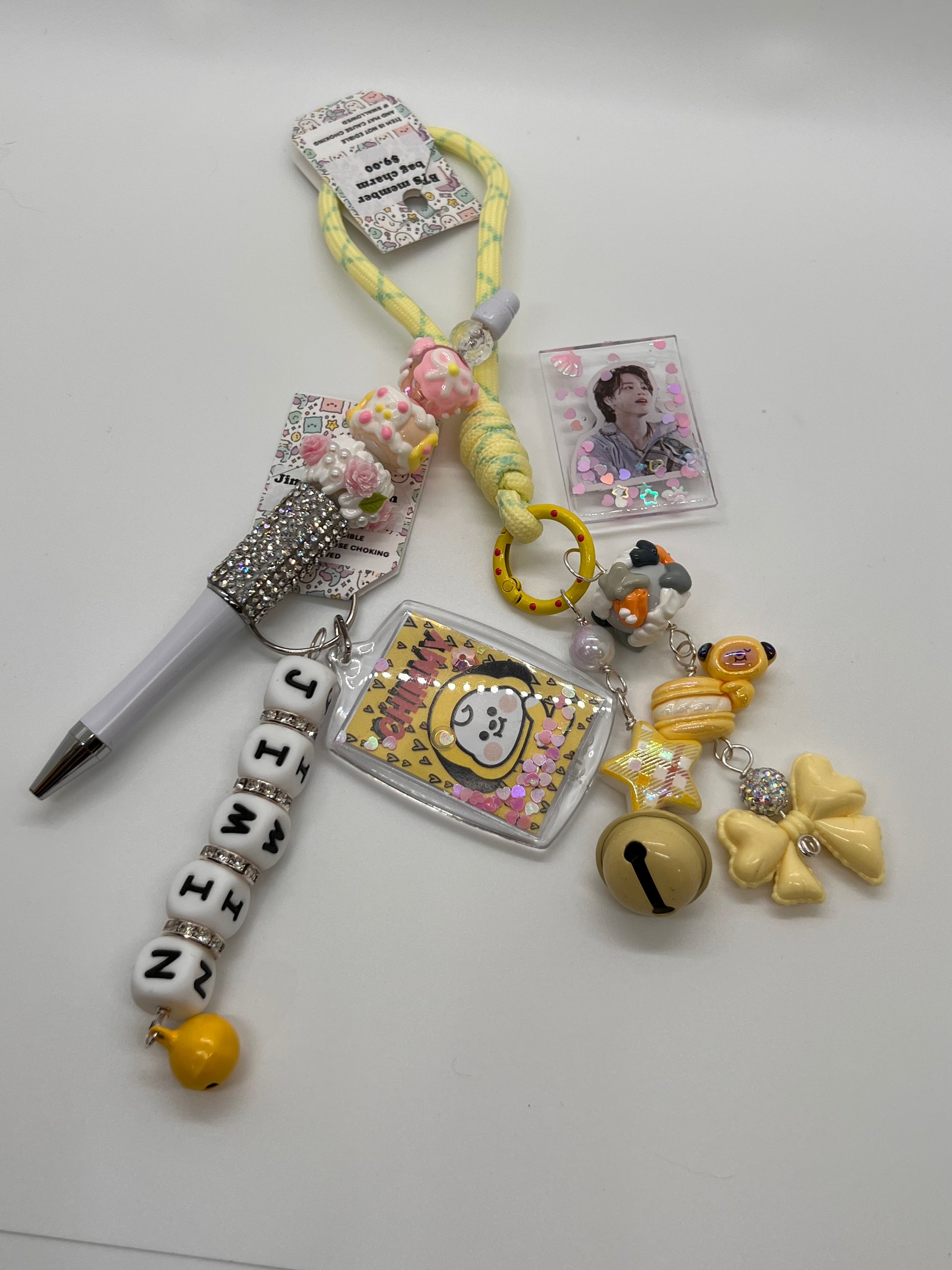 Celebrate your love for Jimin with this exclusive fan set, featuring a magnet, keychain, Chimmy bag charm, and sparkling rhinestone pen. Each piece is crafted with attention to detail and quality materials, combining style, durability, and playful charm. Lightweight and versatile, this set is perfect for personal use, accessorizing your everyday items, or gifting to fellow Jimin fans.