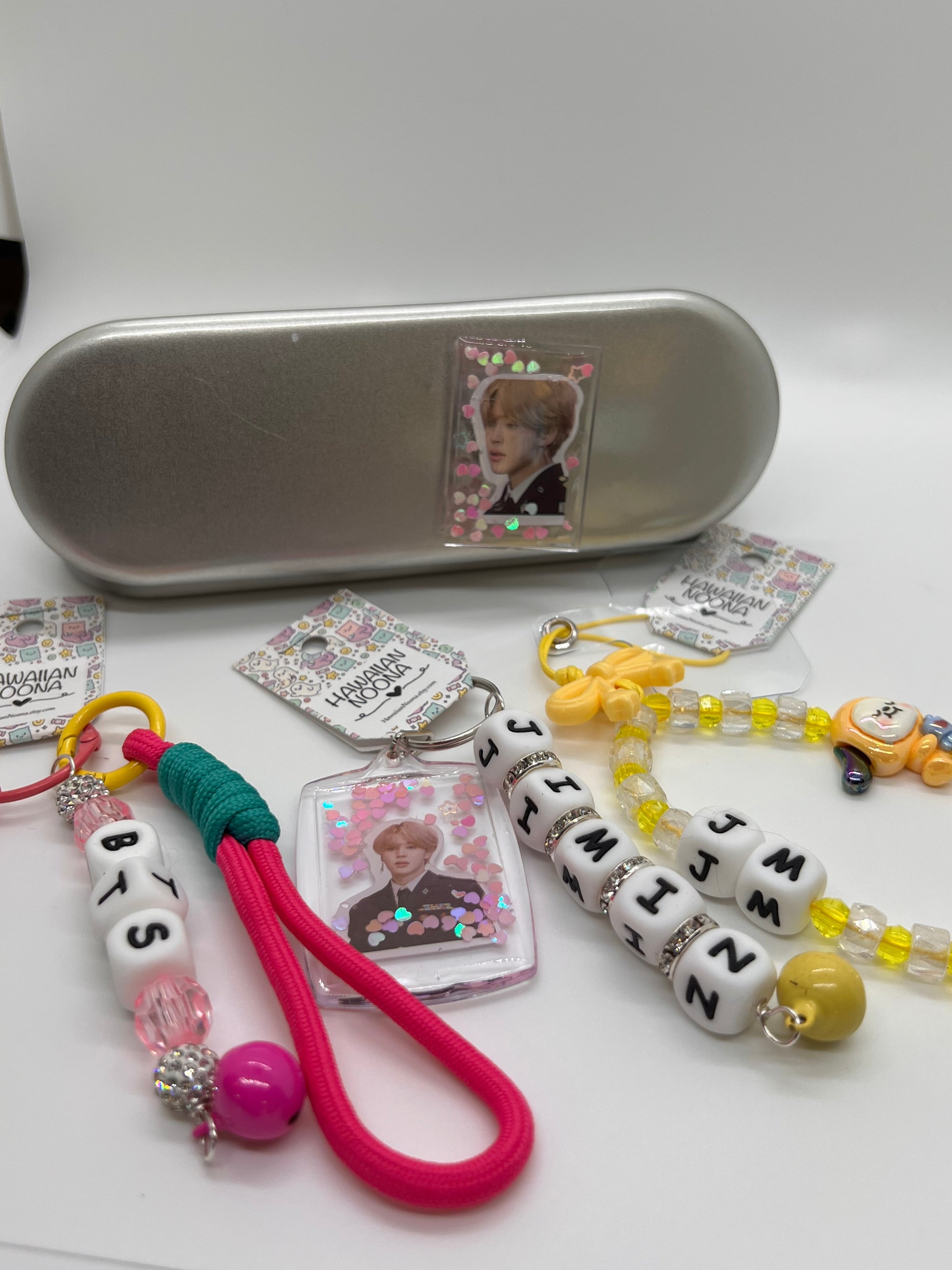 Celebrate your love for Jimin with this exclusive fan set, featuring a magnet, BTS bag charm, JM phone strap, and keychain. Each item is crafted with quality materials and attention to detail, combining style, durability, and playful design. Lightweight and versatile, this set is perfect for accessorizing your everyday essentials, personal use, or gifting to fellow Jimin fans.