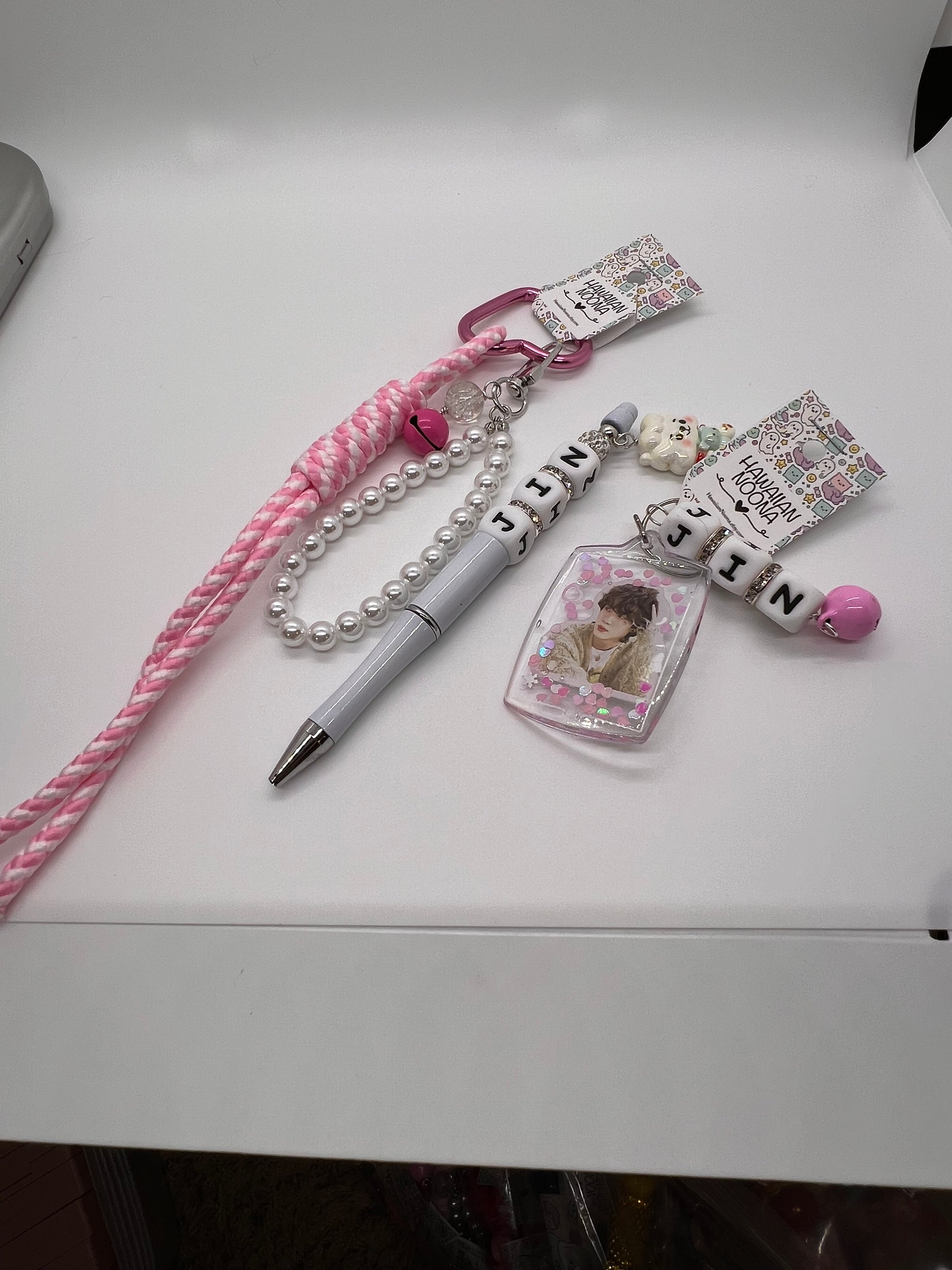 Celebrate your love for Jin with this charming fan set, featuring a pen with RJ hanging onto it, a Jin keychain, and a pink bag charm. Each piece is thoughtfully crafted with quality materials and playful design details, combining style, functionality, and fandom flair. Lightweight and versatile, this set is perfect for personal use, accessorizing your everyday items, or gifting to fellow Jin and BTS fans.