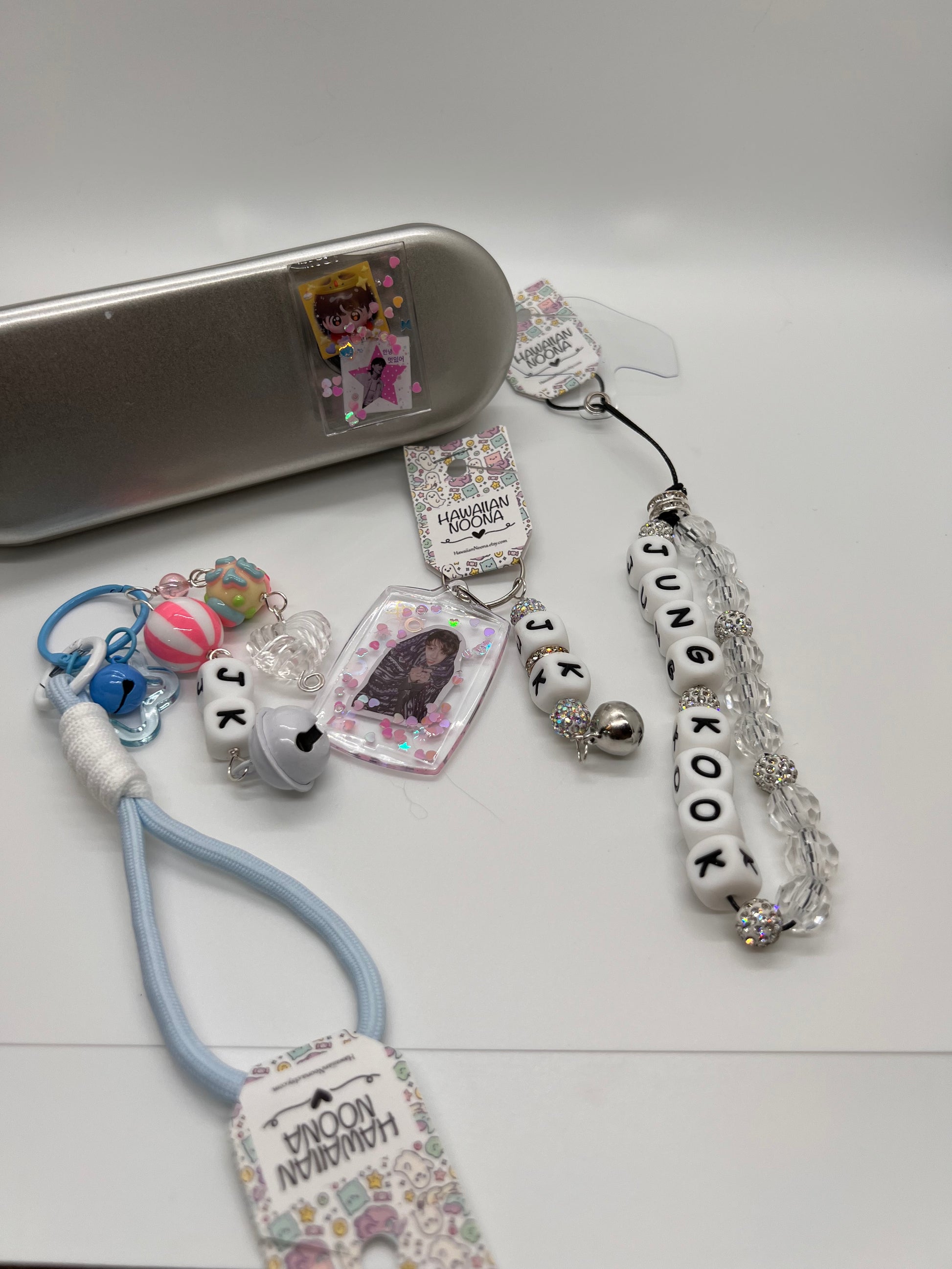 Showcase your fandom with this exclusive JK fan set, including a magnet, keychain, phone strap, and bag charm. Each piece is crafted with quality materials and playful design details, combining style and functionality. Lightweight and durable, this set is perfect for accessorizing your bags, keys, or personal space, and makes a thoughtful gift for any JK fan.