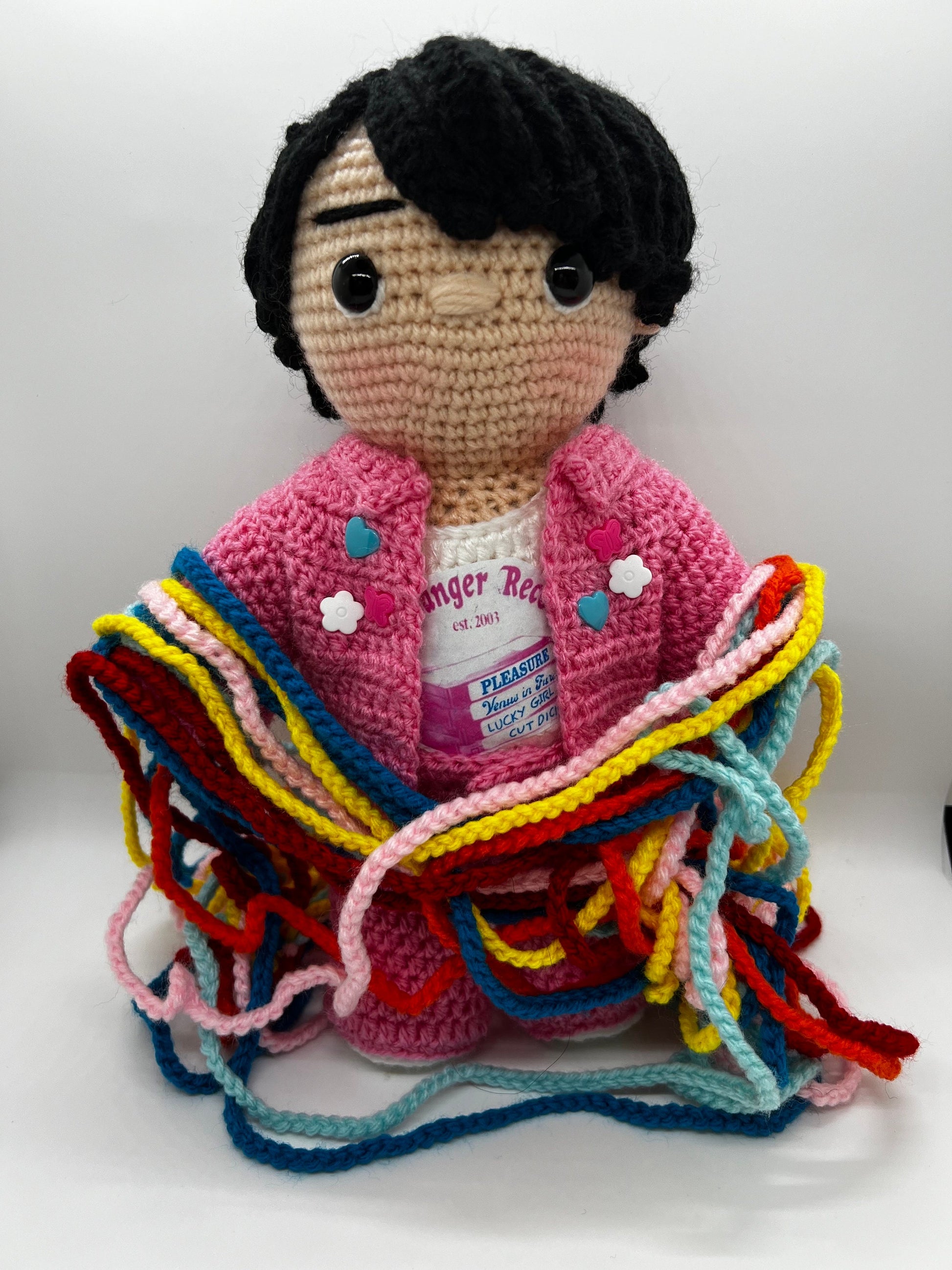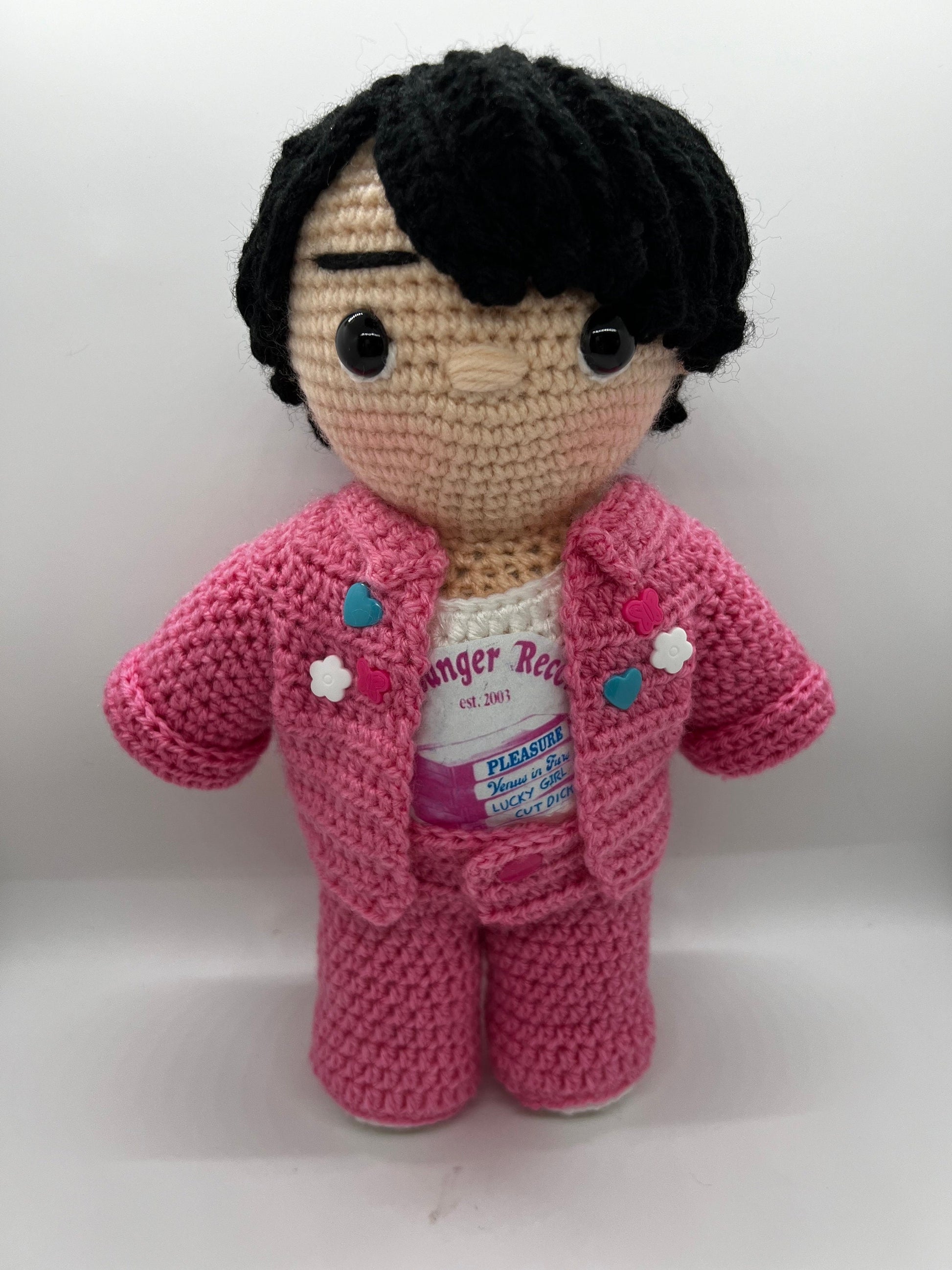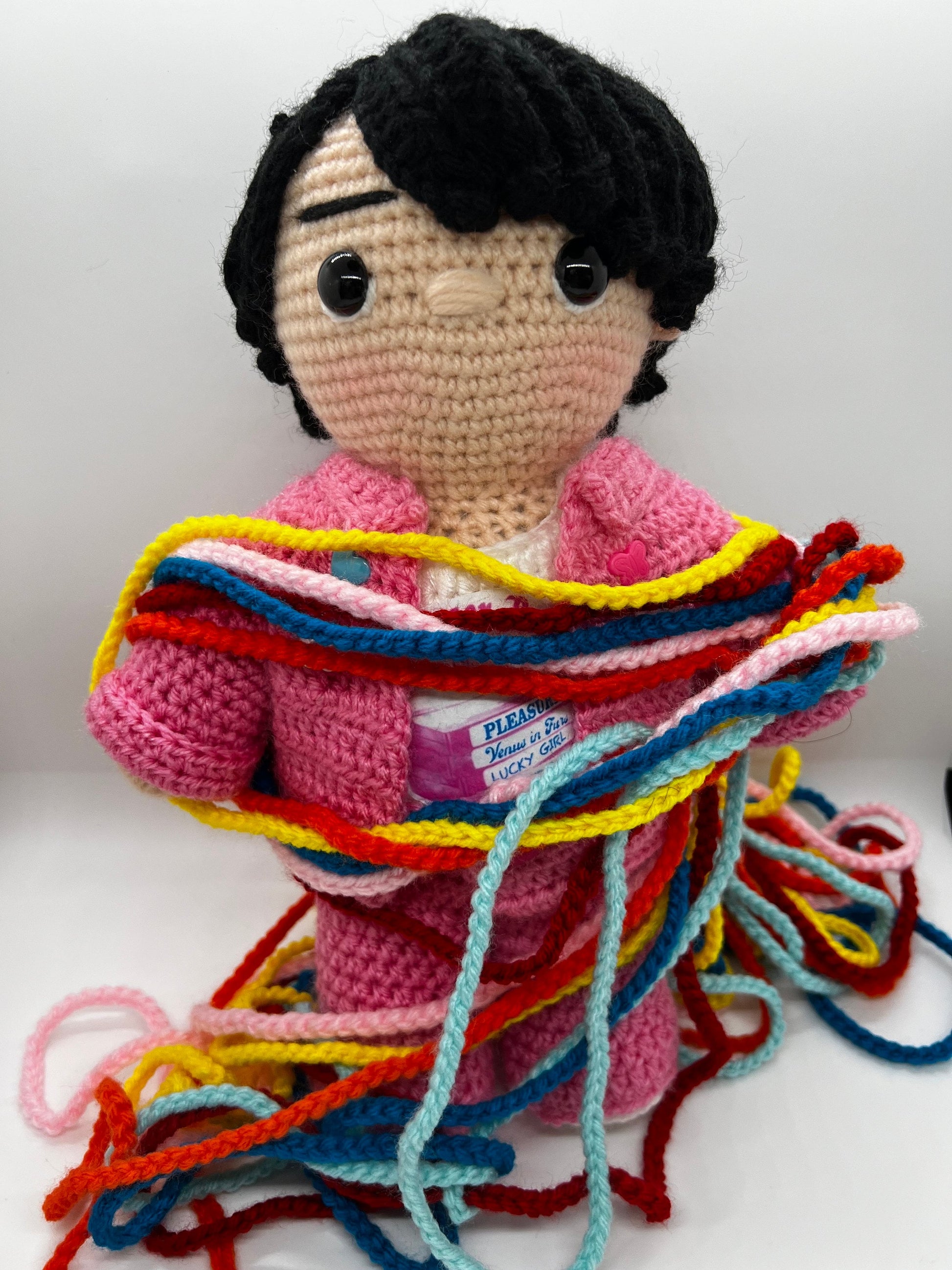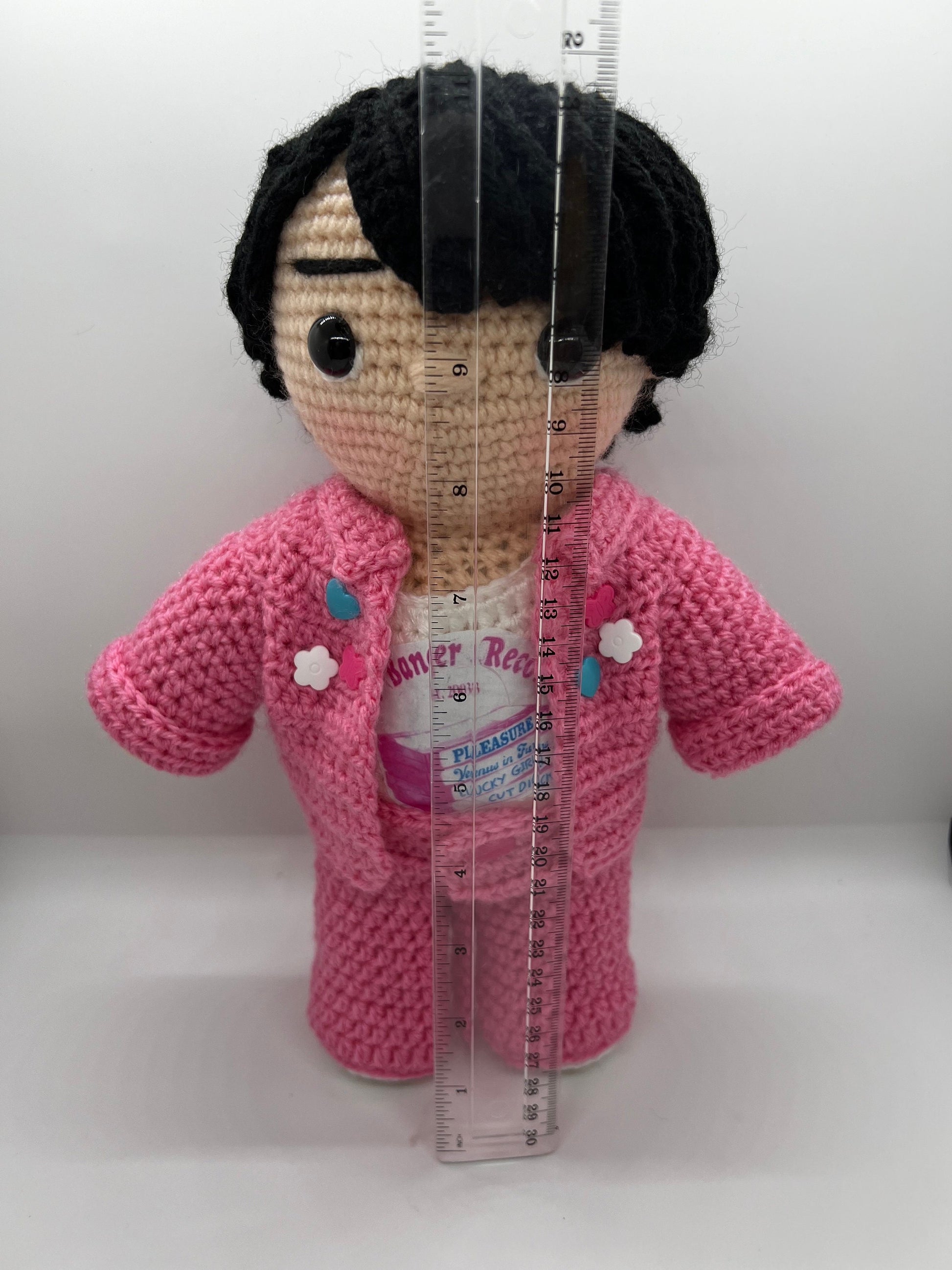 - He is about 11 inches tall, made of 100% acrylic yarn, stuffed with polyfill and has plastic safety eyes so should not be used as a toy for small children.
