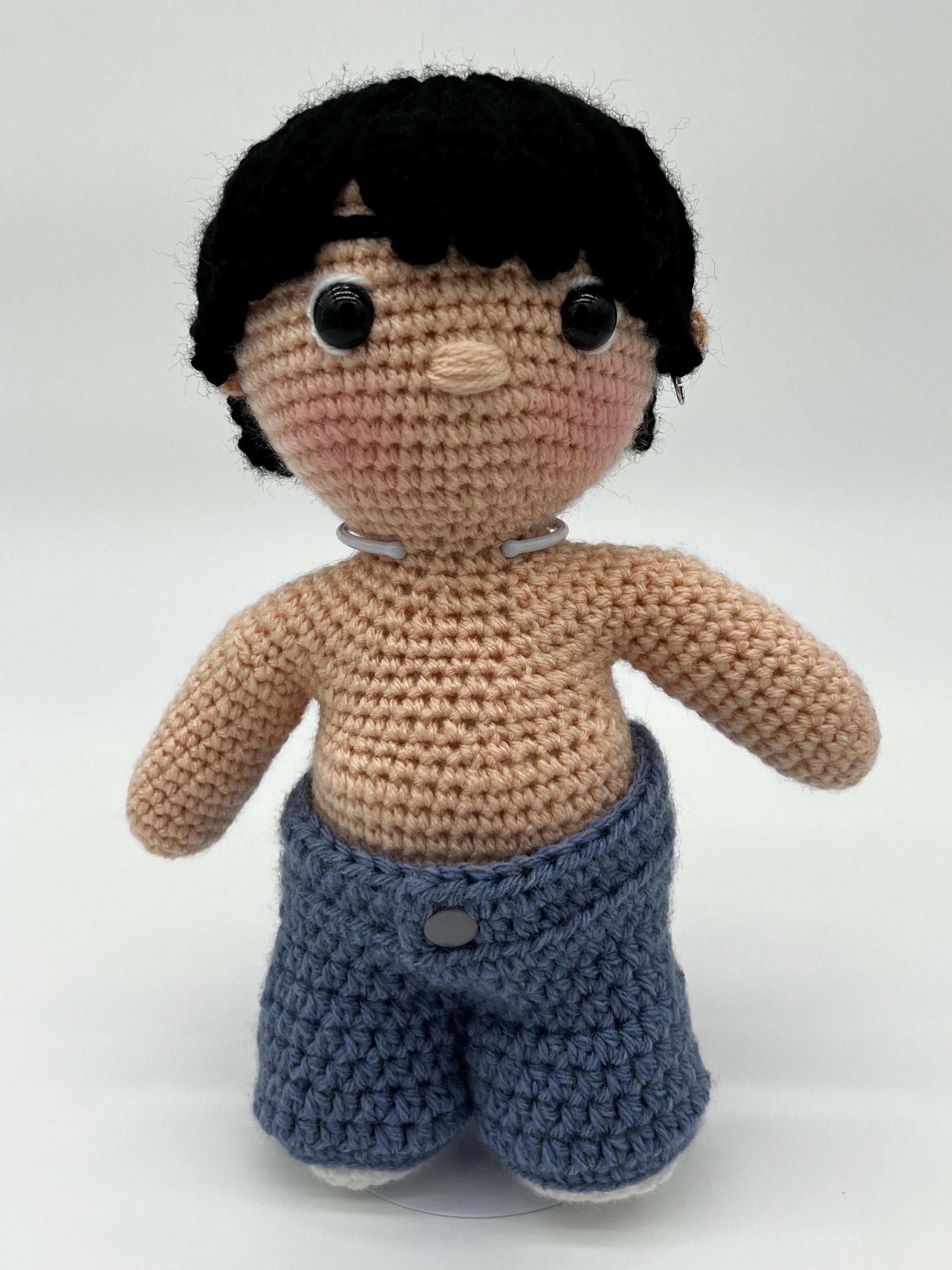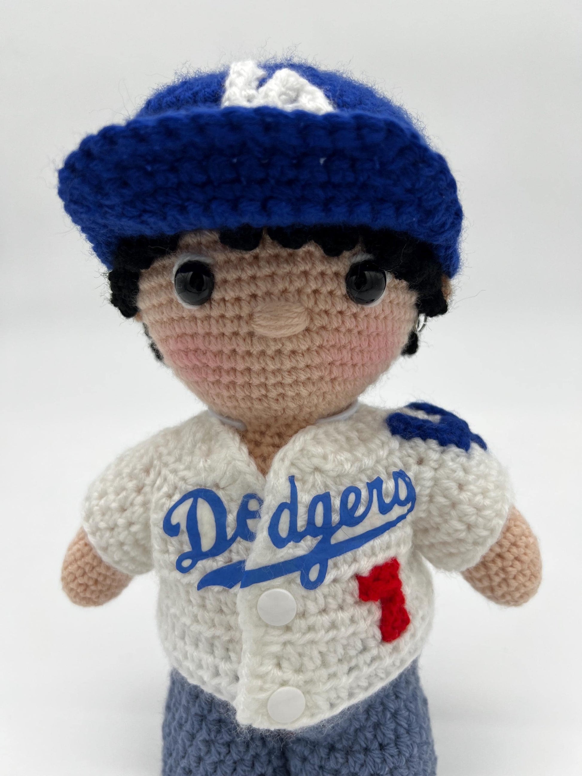 - The Dodgers logo on the front of the shirt is heat-transfer iron-on, as crocheting that logo was not possible. The doll has plastic safety eyes so the doll should not be used as a toy for a small child as it is small enough to be swallowed.