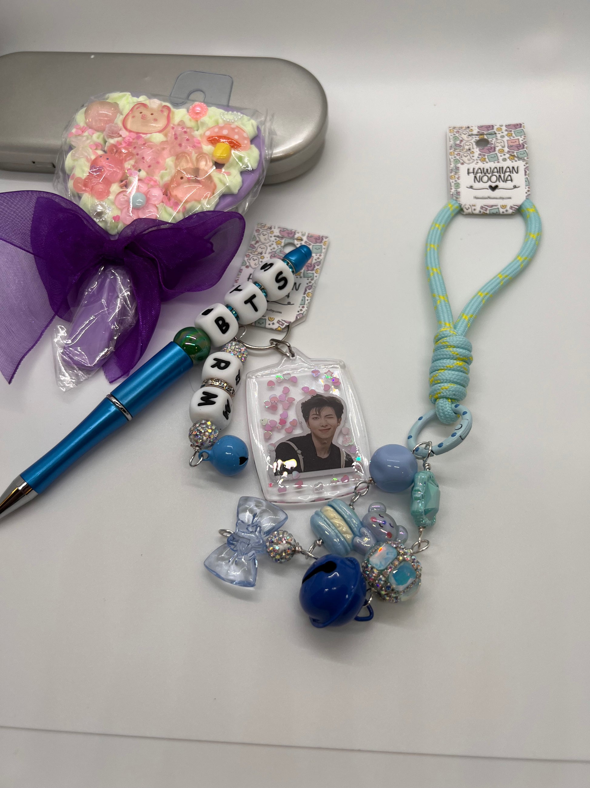Celebrate your love for RM and Koya with this unique fan set, featuring an RM keychain, BTS beaded pen, Koya bag charm, and a decoden-decorated heart-shaped hand mirror. Each item is thoughtfully crafted with quality materials and playful design details, combining style, functionality, and charm. Lightweight and versatile, this set is perfect for personal use, accessorizing your belongings, or gifting to fellow BTS fans.