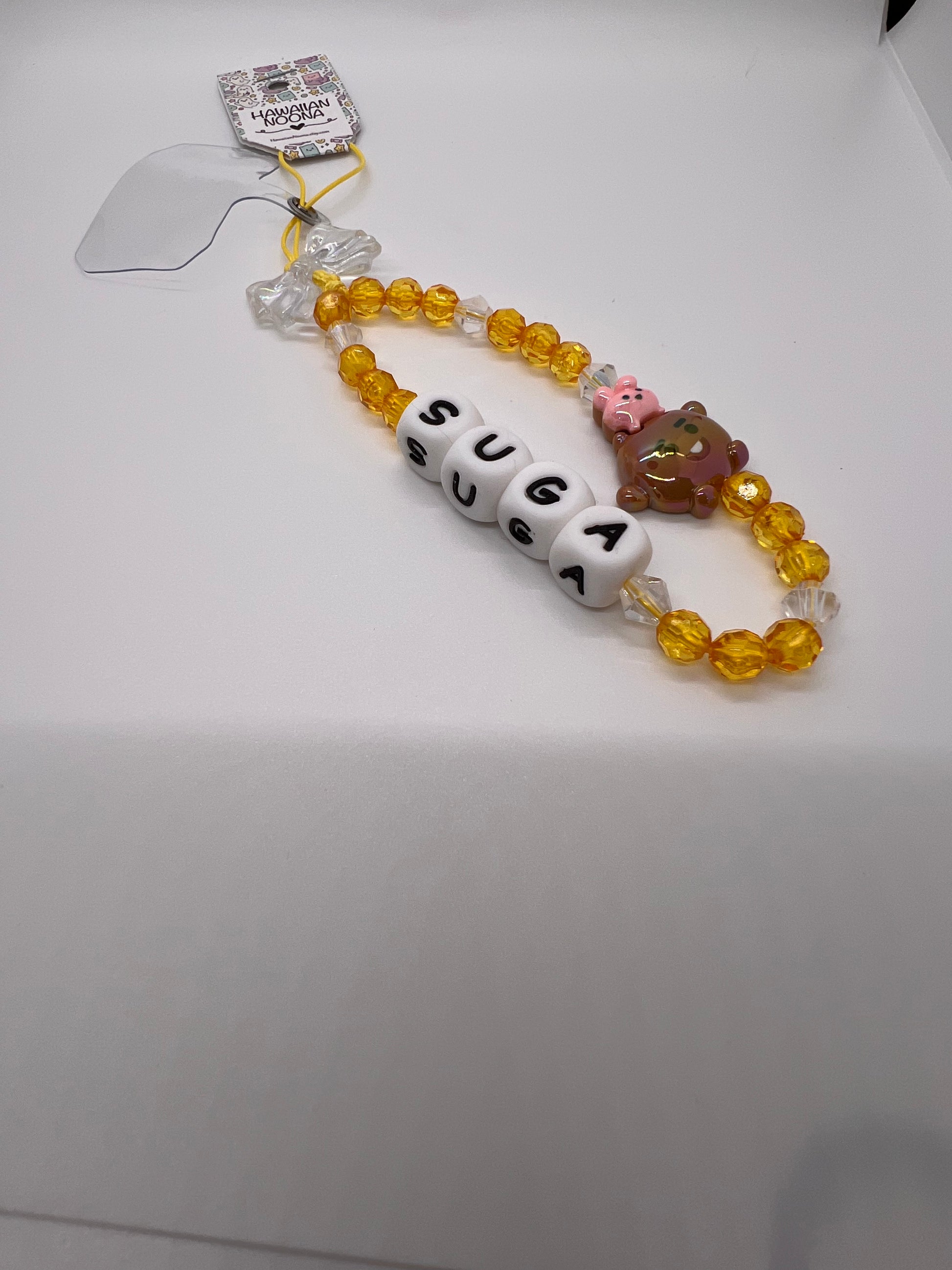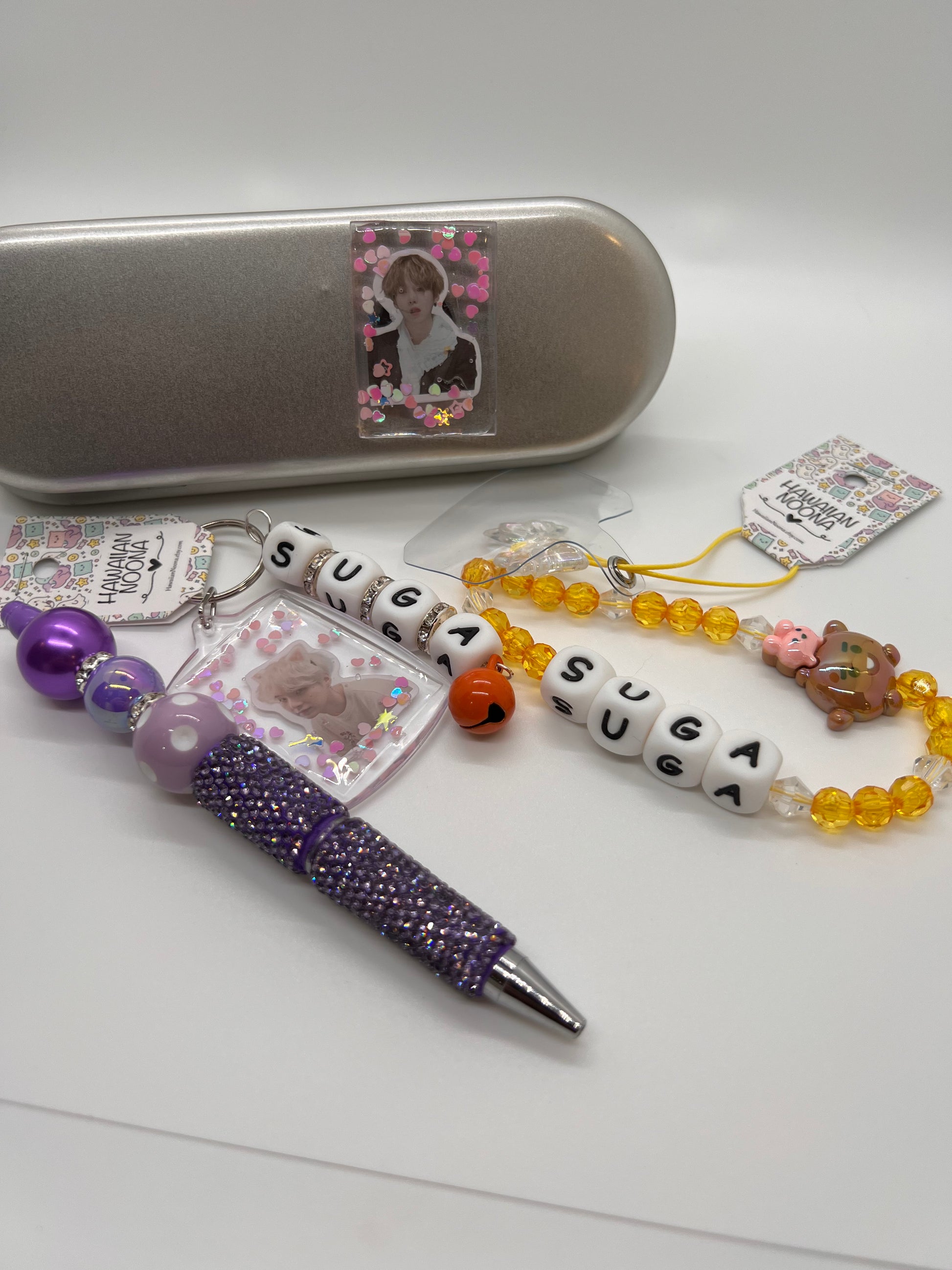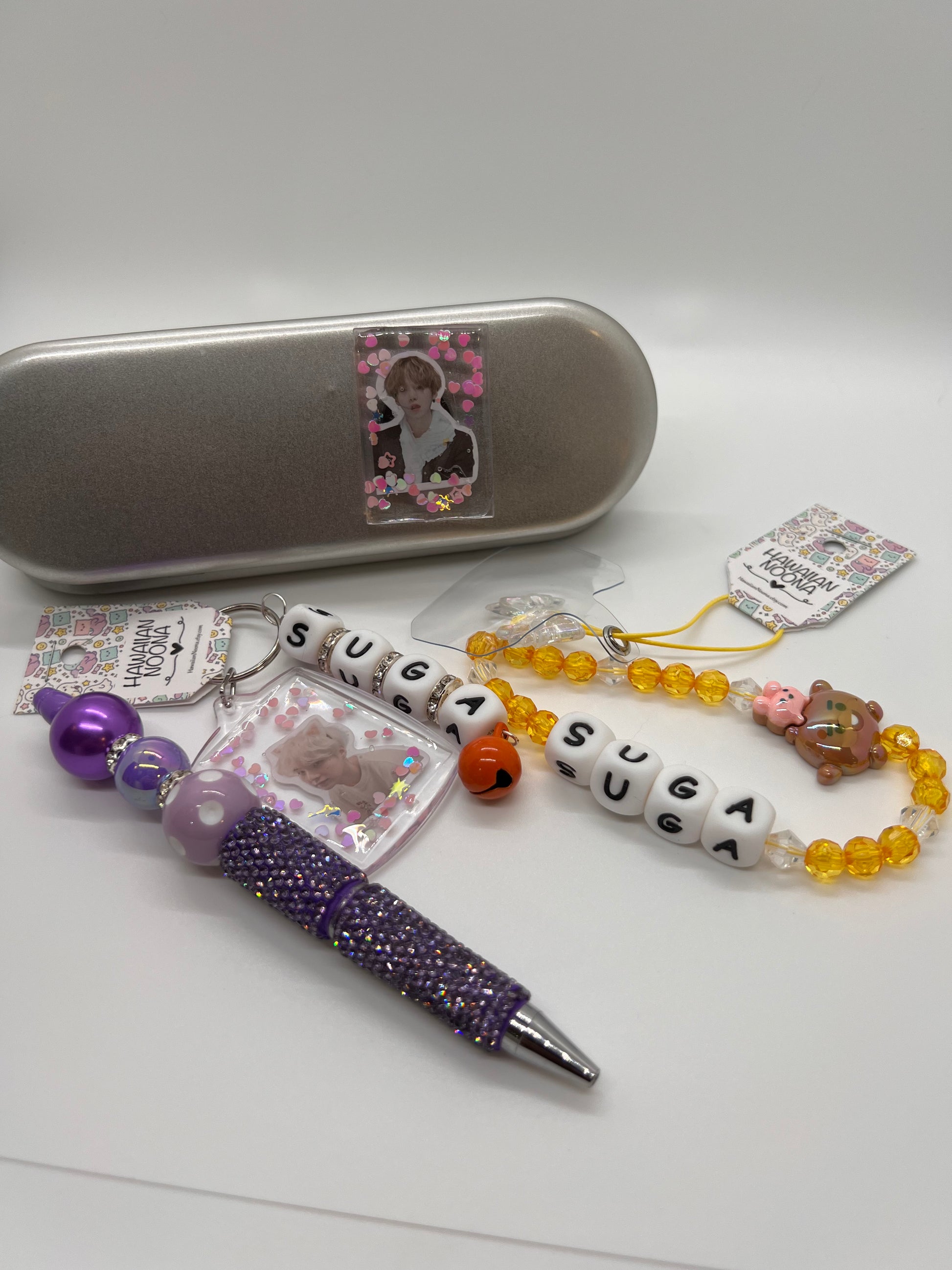 Celebrate your love for SUGA with this exclusive fan set, featuring a keychain, phone strap, magnet, and beaded pen. Each piece is crafted with quality materials and playful design details, combining style, durability, and fandom flair. Lightweight and versatile, this set is perfect for personal use, accessorizing everyday items, or gifting to fellow SUGA and BTS fans.
