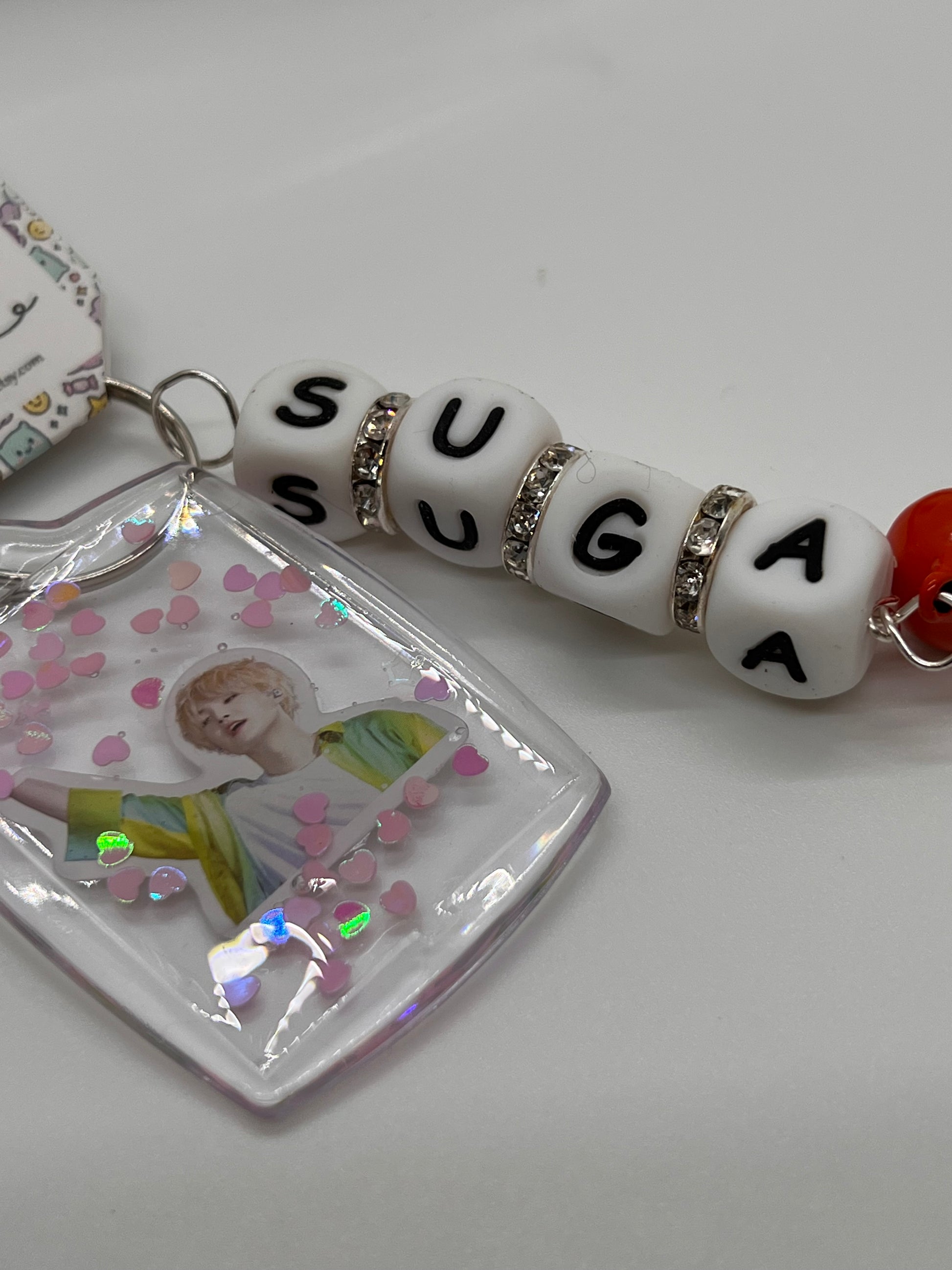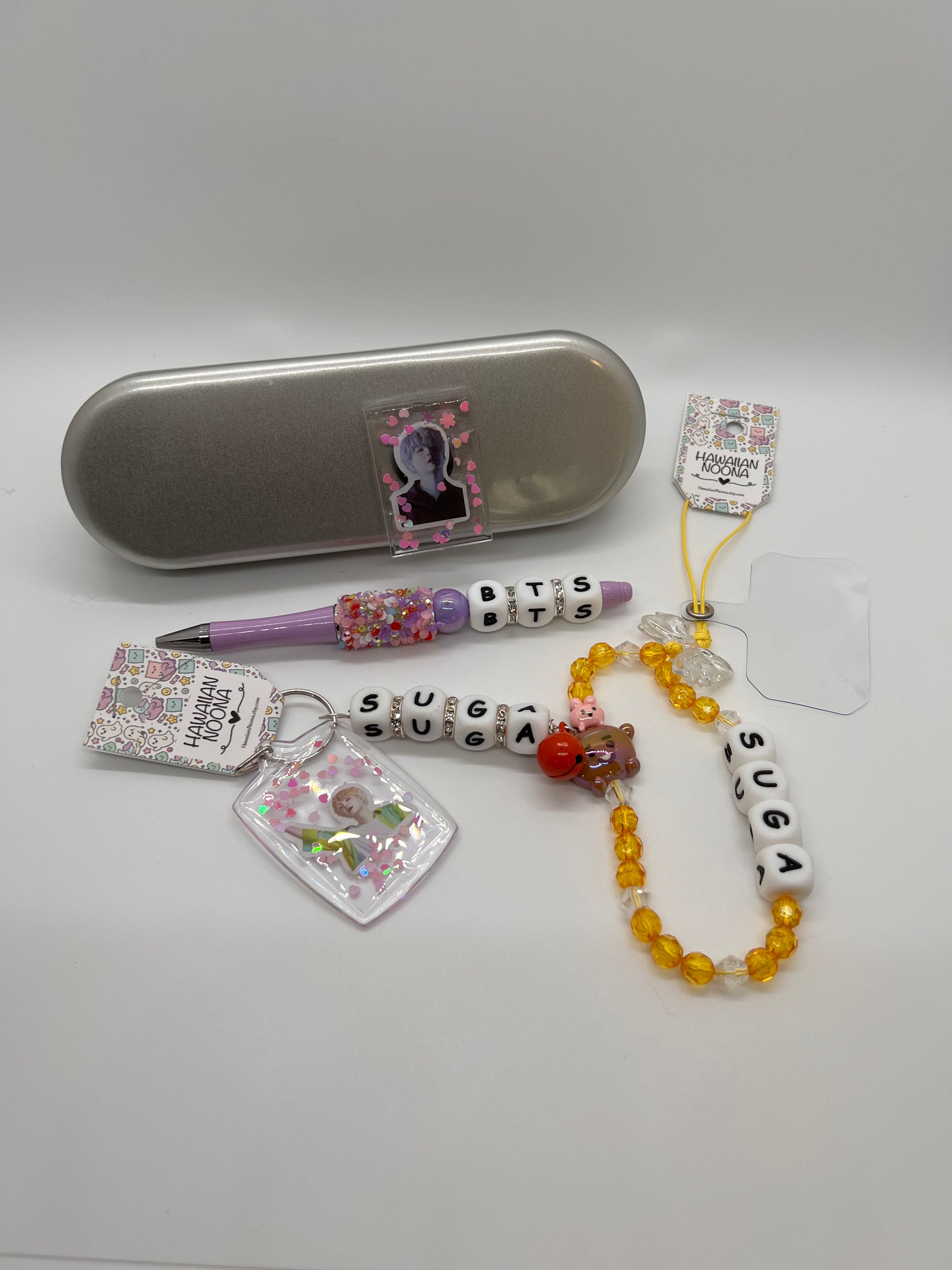 Celebrate your love for BTS with this exclusive SUGA-themed collection. Featuring a sparkling rhinestone pen, a stylish SUGA magnet, a convenient SUGA phone strap, and a durable SUGA keychain, this set is perfect for fans who want to showcase their fandom in everyday life. Ideal for gifting or personal use, each item combines functionality with a touch of K-pop charm.